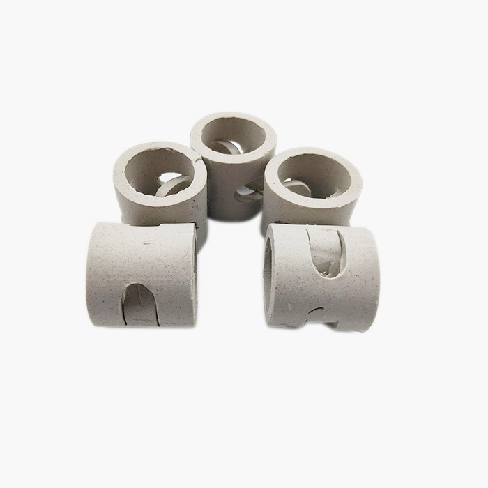陶瓷鮑爾環(huán)填料是在陶瓷拉西環(huán)的基礎上開發(fā)的一種高徑相等的開孔環(huán)型填料,每層窗孔有5個舌葉,每個舌葉內(nèi)彎指向環(huán)心,上下兩層窗孔的位置相反錯開,一般開孔面積約占環(huán)壁總面積的30%左右,使得填料塔內(nèi)的氣體和液體能夠從窗孔自由通過,改善了氣液分布,充分利用了環(huán)的內(nèi)表面。