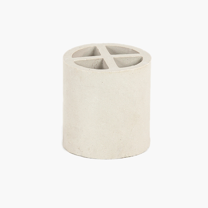 陶瓷十字隔板環(huán)填料是基于增加填料的比表面積,從而強(qiáng)化傳質(zhì)效率而開發(fā)出來的。 其形狀是在拉西環(huán)中間增設(shè)了十字隔板。 一般來講,這種填料由于尺寸較大,僅適用于整體堆徹,目前一般只作為亂堆填料的塔底支撐分布層用。