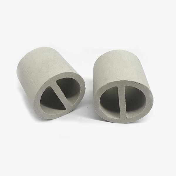 陶瓷一字環(huán)又被稱之為陶瓷勒辛環(huán)。它是在拉西環(huán)原有基礎上基于增加填料的比表 面積和強化傳質(zhì)效率的想法之上在其中間加入像漢字一的一般的隔板而設計出來的。形象化地稱它為一字環(huán)。陶瓷一字環(huán)是由陶瓷拉西環(huán)改良形成,比陶瓷拉西環(huán)有更大比表面積和更好的抗壓強度,擁有優(yōu)異的耐酸和耐熱性,能夠并且能耐除氫氟酸以外的各種無機酸、有機酸及有機溶劑的腐蝕,并能夠在高溫或者低溫的環(huán)境下使用,因此其使用范圍非常廣泛。
