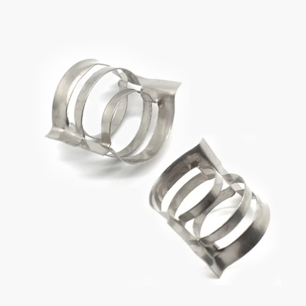 金屬共軛環(huán)填料揉合了環(huán)形和鞍形填料的優(yōu)點(diǎn),采用共軛曲線肋片相結(jié)構(gòu),兩端外卷邊及合適的長徑比、填料間或填料于踏壁間均為點(diǎn)接觸,不會產(chǎn)生疊套、孔隙均勻、阻力小、亂堆時(shí)取定向排列,故有規(guī)整填料的特點(diǎn),有較好的流體力學(xué)和傳質(zhì)性能。